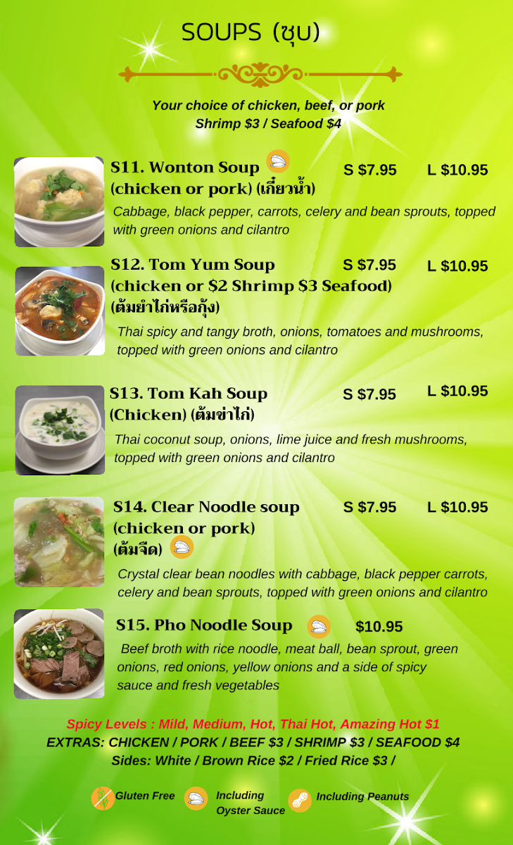 Thai spicy and tangy broth, onions, tomatoes and mushrooms, topped with green onions and cilantro.