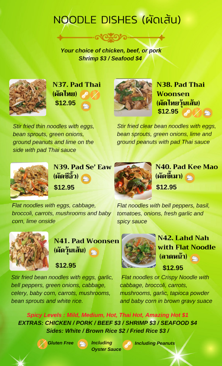 Gluten-free. Including oyster sauce and peanuts. Stir fried thin noodles with eggs, bean sprouts, green onions, ground peanuts and lime on the side with pad Thai sauce. Comes with your choice of meat.