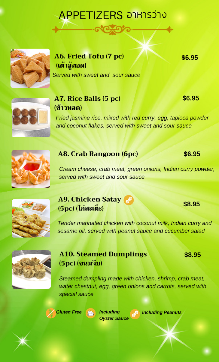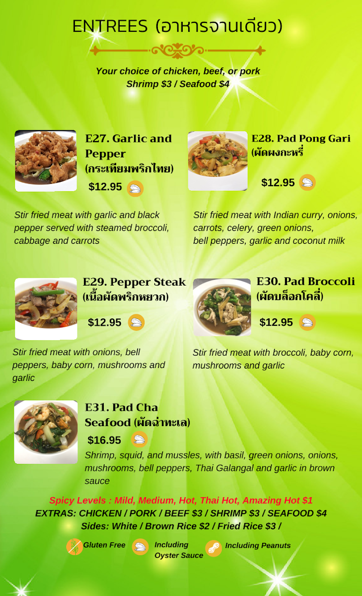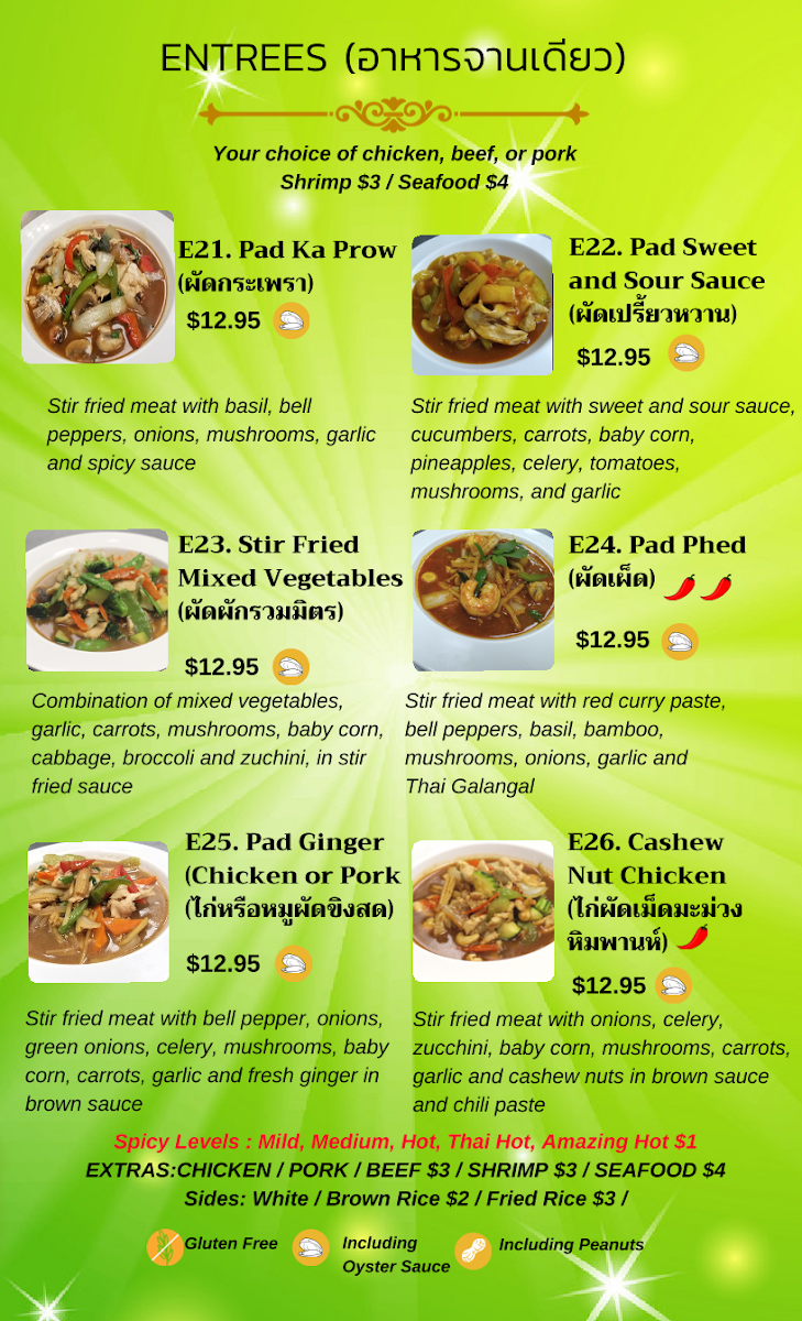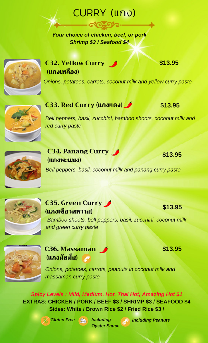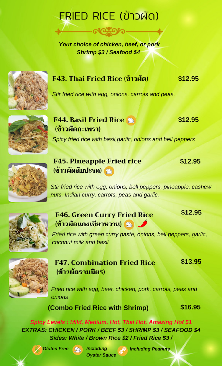 Spicy. Including oyster sauce. Fried rice with green curry paste, onions, bell peppers, garlic, coconut milk and basil. Comes with your choice of meat.