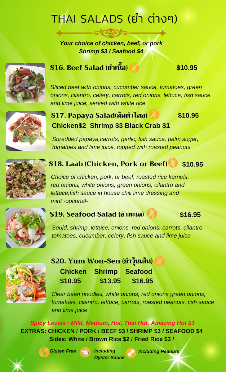 Shredded papaya, carrots, garlic, fish sauce, palm sugar, tomatoes, lime juice, with roasted peanuts. *** For catering deliveries please allow up to 12hrs; for pickup catering we can get to your order quickly! ***